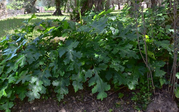 Pianta famosa per aver ispirato il capitello corinzio, ché ne stilizza la foglia. È erbacea perenne non molto alta poiché, anche se le foglie sono grandi, ha fusti poco sviluppati. In compenso può dar luogo a formazioni estese e lussureggianti. Sono le foglie ampie, lucide, verde brillante, la sua cifra. In Orto vive più di un esemplare.