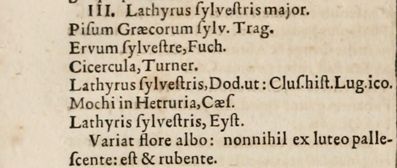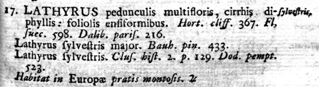 Pagina 733. Linneo ricorda le infiorescenze a racemo e i viticci – Diadelphia decandria. Lathyrus sylvestris major lo chiamava Gaspard Bauhin (in realtà p. 344 e non 433), forse da qui Linneo prende il nome di specie.