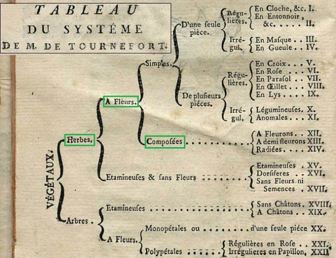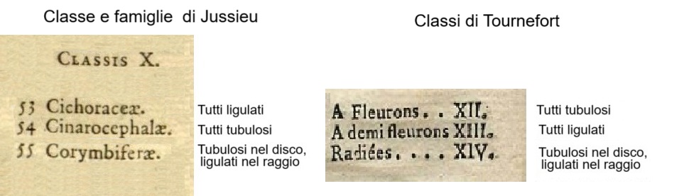 È istruttivo leggere in dettaglio la descrizione delle famiglie. Prendiamo le mosse da Tournefort e a titolo di esempio scegliamo la XIII classe: Composèes a demi fleurons (solo flosculi ligulati) (pagina 372, tomo1, Elemens de Botanique, Parigi, 1694).