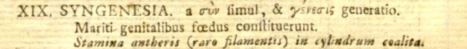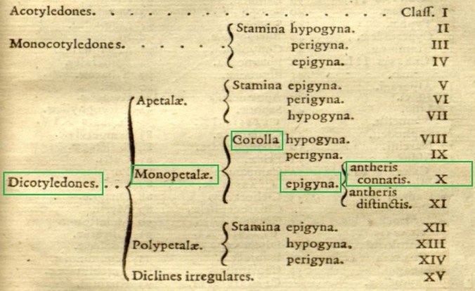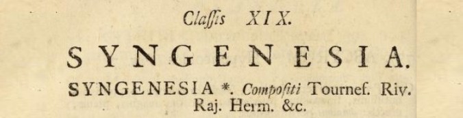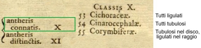 Non è superfluo notare che il carattere ‘antere connate’ (fiore sinanterico o singenesico) scelto da Jussieu è preso pari pari da Linneo (Syngenesia). Anche Jussieu saliva sulle spalle dei giganti…