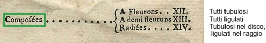 Le Composite sono a loro volta suddivise in tre classi e numerose sezioni. Per la prima volta, merito di Tournefort, le troviamo tutte raccolte in bell’ordine a seconda che abbiano: solo flosculi tubulosi (Composèes a fleurons), solo flosculi ligulati (C. a demi fleurons), flosculi tubulosi nel disco e ligulati nel raggio (C. radièes)