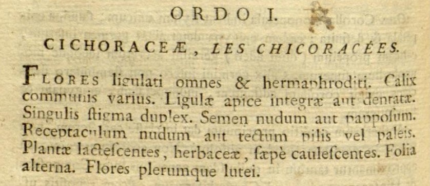 Confrontiamo la descrizione con quella della corrispondente famiglia (Cichoriaceae) di Jussieu (pagina 168, Genera Plantarum, Parigi, 1789).