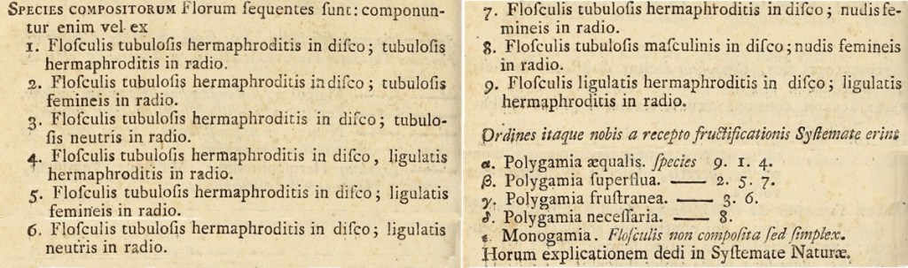 La pagina 372 di Genera Plantarum. Ammiriamo l’ars combinatoria di Linneo nell’enucleare in quattro gruppi (da alfa a delta) le nove composizioni (da 1 a 9) messe in atto dalla Natura. Ad esempio Polygamia aequalis si ottiene dalle configurazioni 9, 1 e 4, che hanno fiori bisessuali sia nel disco sia nel raggio, non importa se tubulosi o ligulati.