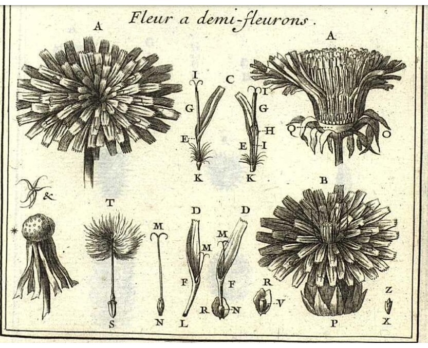 Fiori a flosculi ligulati – I fiori sono mazzi A o B appiattiti, composti da soli flosculi ligulati C o D che di solito formano cerchi concentrici. La parte a forma di foglia C o D è sei volte la base E o F. La guaina G [le antere saldate] il più delle volte inizia con cinque piccoli filamenti H [i filamenti degli stami], e cede il passo a un altro filamento I [lo stilo del pistillo] che proviene dalla base dell’embrione K del seme [l’ovario]. Tutti questi flosculi sono sostenuti da un calice O o P la cui base Q è chiamata strato [ricettacolo comune]. Ognuno di essi porta un embrione [ovario] K o N, e in alcuni generi sono separati l’uno dall’altro da poche foglie R. Quando questi fiori sono appassiti, gli embrioni diventano semi, alcuni dei quali S sono ornati da un pappo T, mentre gli altri V non ce l’hanno. Ci sono semi X di alcuni altri flosculi che sono ornati da una corona molto delicata Z, e altri & che hanno un pennacchio di foglioline. (tavola 251, tomo 3, Elemens; testo: pagina 372, tomo 1)