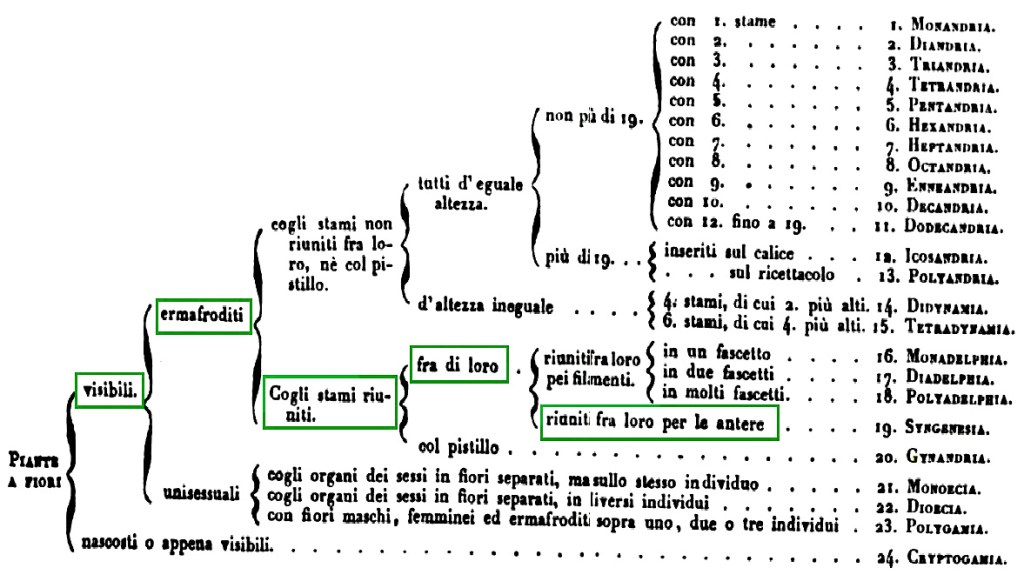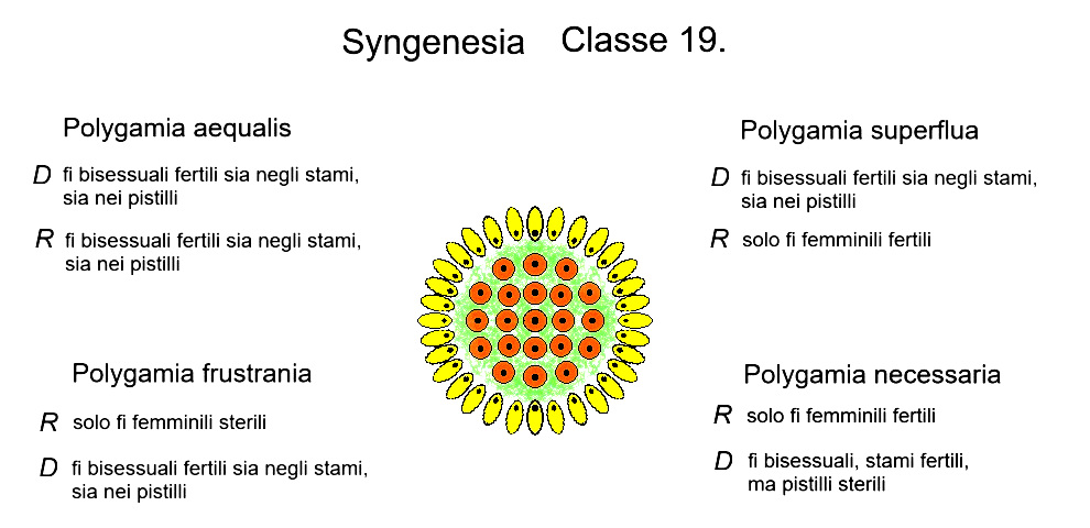 Il percorso delle composite nel sistema di Linneo: piante a fiori visibili > fiori bisessuali > stami saldati per le antere. La classe Syngenesia comprende quattro ordini o famiglie a seconda del tipo di flosculi (attenzione nel senso del tipo, ma del sesso: bisessuali, maschili, femminili) e soprattutto della loro fertilità o meno.