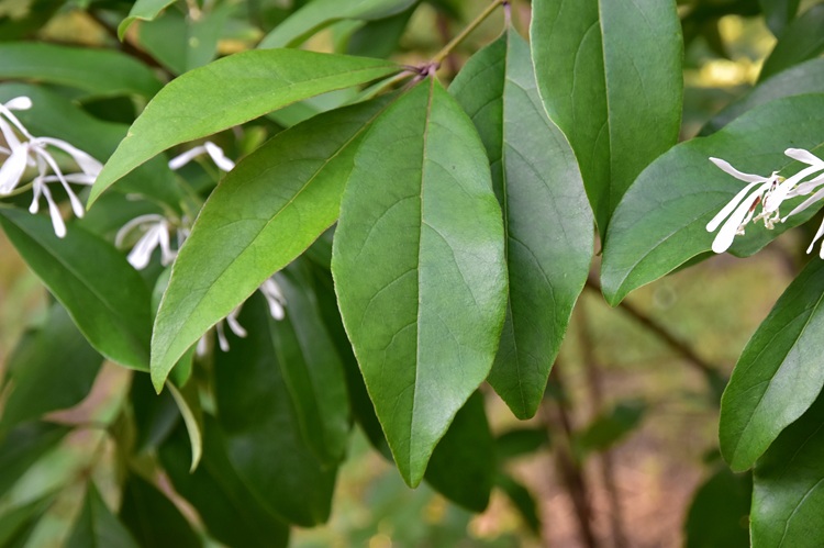 Abita presso la Porta Nord. Le piante dell’Orto appena possono si espandono, il nostro ha lanciato grossi rami verso il recinto, ma non sfuggirà alla costante opera di contenimento dei giardinieri. In maggio è una esplosione di bianco. E non si può dire che non si faccia notare. Lui è un maschio ma con molti fiori bisessuali.L’angolo dell’arbusteto dove vive è ameno (settore XX), e invita a rilassarsi. La foglia cuoiosa e spessa ricorda quella dell’osmanto. Picciolo breve; bordo intero o con denti appena accennati.Base da ottusa a acuta; vertice, come già detto, spesso smussatoLamina liscia, lucida, verde profondo. Molto più chiara la pagina inferiore. Venature ben visibili e coperte da leggera peluria, anche il picciolo è villoso. Fillotassi opposta.Foliage in novembre. Questo esemplare che viveva in prossimità della vecchia entrata è morto da qualche tempo – foto del novembre 2018. I fiori sono piccoli e raccolti in pannocchie alquanto povere, ciò nonostante la grande abbondanza di infiorescenze produce l’effetto già più volte descritto. Coi fiori in boccio si distingue meglio la pannocchia (grappolo di grappoli).Quattro petali allungati simili a nastri; ricordano quelli del loropetalo. Si saldano alla base in un piccolo bicchiere.Calice a quattro lobi stretti e appuntiti. Nella foto si distinguono gli stami coi filamenti saldati alla parete interna della corolla, che all’altezza delle antere si macchia di rosso violaceo.Pistillo a fiaschetta, ovario panciuto, stilo brevissimo e per stigma una sferetta al modo di certe caramelle gommose.Ovario a due logge e per ogni scomparto due ovuli, ma solo uno di tutti sarà fecondato.