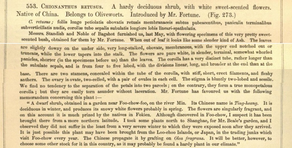 Chionanthus retusus Lindl. & Paxton Nome imposto da John Lindley (1799-1865) e Sir Joseph Paxton (1803-1865) entrambi botanici inglesi. Il primo di modeste origini lavorò come assistente all’erbario del ben più famoso e abbiente Sir Joseph Banks, e ha al suo attivo numerose pubblicazioni (nonché un sistema tassonomico del quale priamo o poi dovremo parlare). Il secondo oltre che giardiniere-scienziato fu anche affermato architetto. l nome della specie compare per la prima volta in Paxton’s flower garden, pagina 85, fascicolo 3, Londra, 1853. La rivista ha bellissime illustrazioni, girovagare per gli articoli è un piacere.