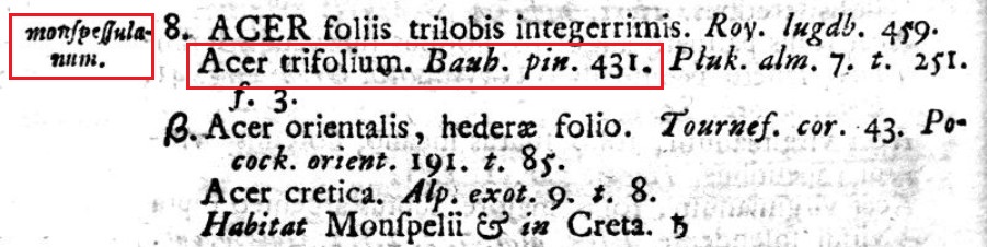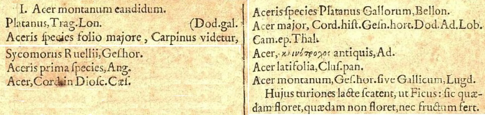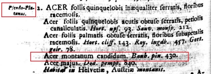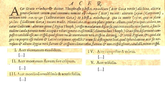 È piuttosto evidente che gli aggettivi apposti al termine ‘Acer’ (sia da parte di Bauhin sia da parte dei suoi predecessori) servivano a distinguere specie diverse fra piante che primariamente venivano riconosciute come aceri. (Appendice 1)