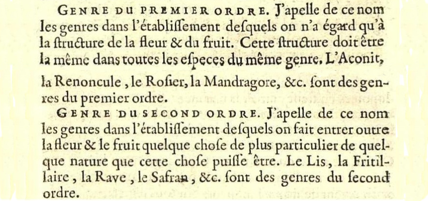 Ma un conto è la consapevolezza dell’esistenza di un concetto, altro è formularne una definizione. E qui entra in gioco Tournefort, in Elemens de botanique ou methode pour connoitre les plantes, Parigi, 1694, pagina 542 egli scrive: