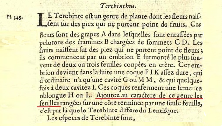 Subito dopo (e sempre nelle stessa Sezione (famiglia), pagina 451) Tournefort nomina il genere Lentiscus facendone quindi un insieme separato dal Terebinthus, giacché i lentischi hanno foglioline in numero pari.