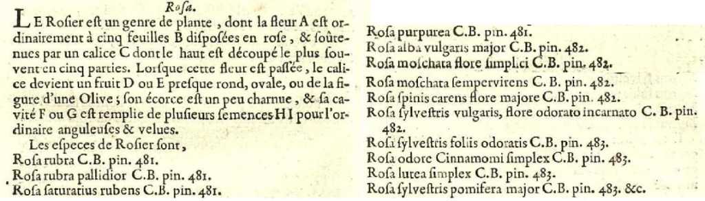 Alla descrizione segue l’elenco delle specie di Rosa note a Tornefort. Neanche a farlo apposta tutti i riferimenti sono al Pinax di Bauhin. (Appendice 2)