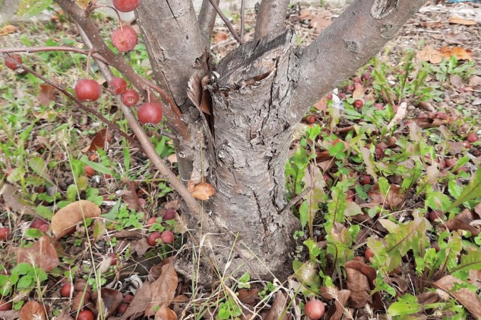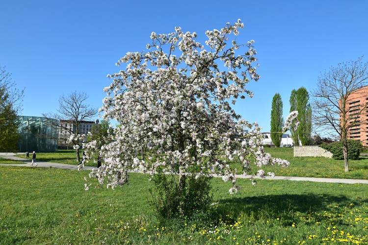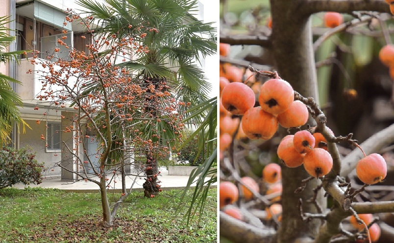Il mondo dei meli ornamentali è vasto e articolato e non è facile districarsi fra le numerose specie, tutte, fra l’altro, ricche di cultivar. Ma quello che è peggio è che si somigliano maledettamente fra loro. Il Cacciatore di Alberi è avvisato: deve munirsi di tenacia e pazienza. Tuttavia, come vedremo, gli strumenti per una corretta identificazione non mancano. L’eroe del post è un piccolo albero dalla chioma quasi cilindrica e leggermente scompigliata, con il fusto diritto e esili rami dall’andamento pressoché orizzontale. Bisogna però considerare il fatto che nei giardini è lasciato crescere privo dei rami più bassi, così la chioma assume forma sferica (globosa).