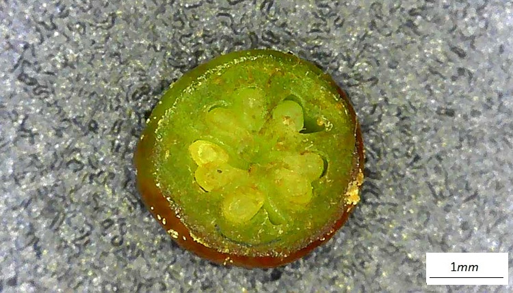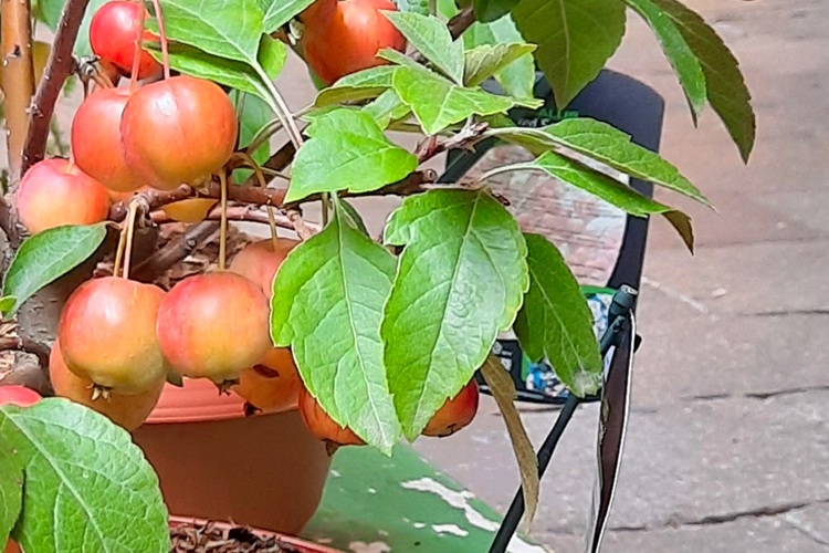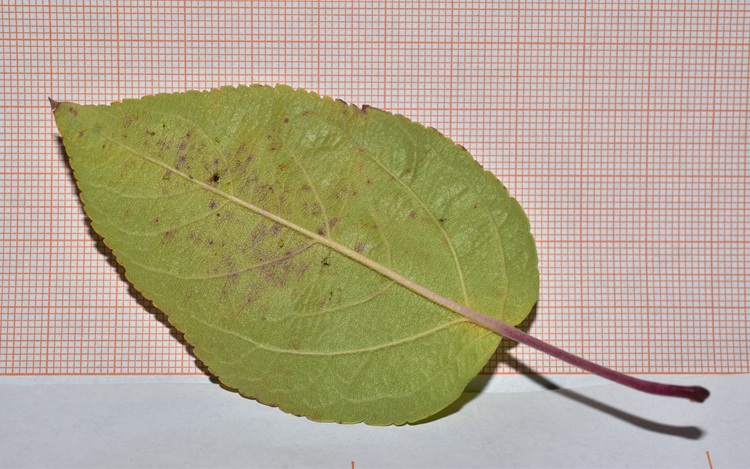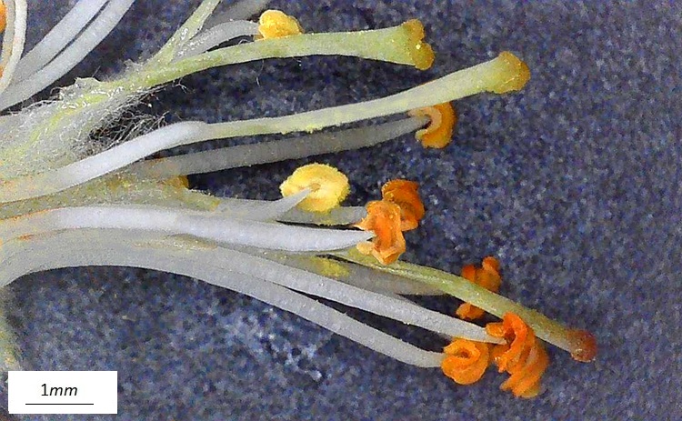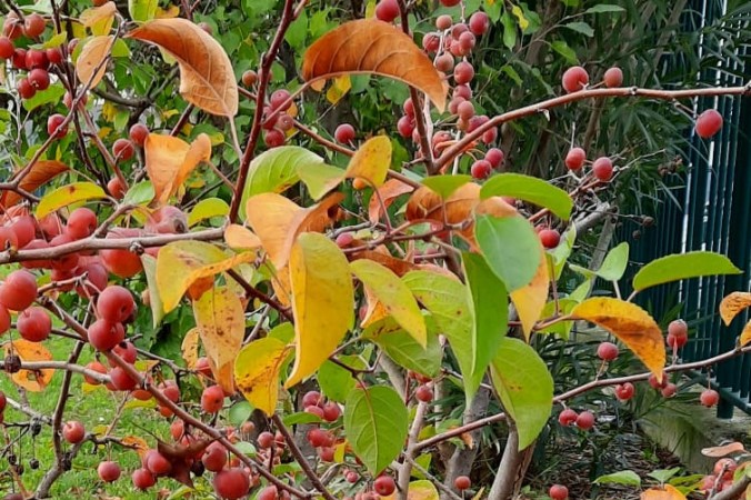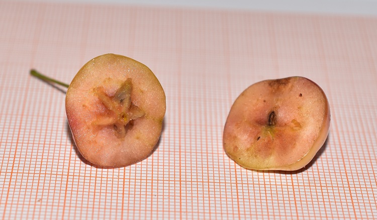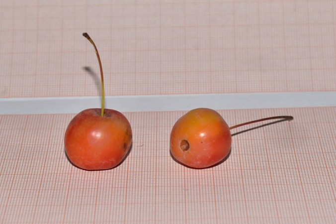 Giardino privato in Via CarducciGiardino privato in Via Tirana. Gennaio, con frutti maturi.La cultivar ‘Hillieri’ in Orto. I fiori sono rosa anche internamente, e la chioma è tondeggiante (rami ascendenti).Giovane esemplare al Parco Europa – ora purtroppo morto. In questo giardino vive un prezioso baccata, specie che prima o poi dovremo descrivere. La cifra di questo albero è, come si sarà capito, la fioritura abbondante Cuscini bianchi macchiati di rosso lanciati in ogni direzioneI rossissimi boccioliInfiorescenze a mazzoliniCorolla bianca o leggermente rosata; petali lunghi, sottili, ben distanziati fra loro (più lunghi e sottili di quelli del cugino domestica).Unghia sottileCalice a simmetria pentagonale, con lunghi lobi triangolari appuntiti e ripiegati all’indietro; più in basso ricettacolo affusolato.Avvicinandosi, fitta peluria sulla parete interna; all’esterno calice e ricettacolo lucidissimi, glabri e grandemente colorati. A destra il fitto fascio dei filamenti. I quali filamenti sono bianchi e diafani. Antere gialle, maturando diventano rossicce.Il pistillo si divide in cima (come per tutti i Malus)in cinque rami verdolini; stigmi ocra, capitati (a testa di chiodo). Asportato il calice si riconoscono i rami dello stilo fusi fra loro e abbondantemente ricoperti di peluria.Ovario infero. Nella foto si distinguono gli ovuli attaccati alla base dell’ovario (placentazione basale).Sezione trasversale dell’ovario. Cinque loculi, ciascuno con più ovuli. A questo link il tipo di disposizione in termini di carpelli (andate alla terza configurazione).Frutti piccoli giallo aranciati (il colore può arrivare fino al rosso in alcune cultivar), picciolo lungo. L’infruttescenza ricorda vagamente (ma molto vagamente) quella dei ciliegi. Ma non è possibile confondersi perché i frutti sono mele in miniatura.Lavoro di cesello attorno al torsolo Il torsolo (il vero frutto poiché il solo a provenire dall’ovario) in tutta la sua nudità.