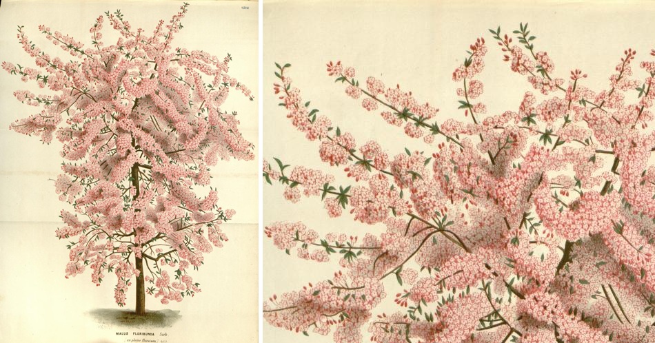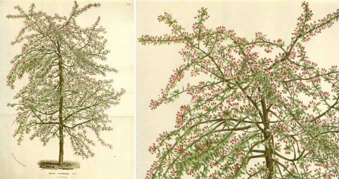 La pagina in predicato. La descrizione di van Houtte comincia con un tributo a Siebold e con l’elenco dei meli da lui portati dall’estremo oriente. Purtroppo, oltre a un ameno racconto di come la pianta sia fiorita nel vivaio, non ci sono altre indicazioni, tranne una precisazione sull’andamento dei rami che tendono a disporsi orizzontalmente. Per fortuna il testo è accompagnato da ottime illustrazioni, preziose per distinguere la specie dagli altri meli da fiore.