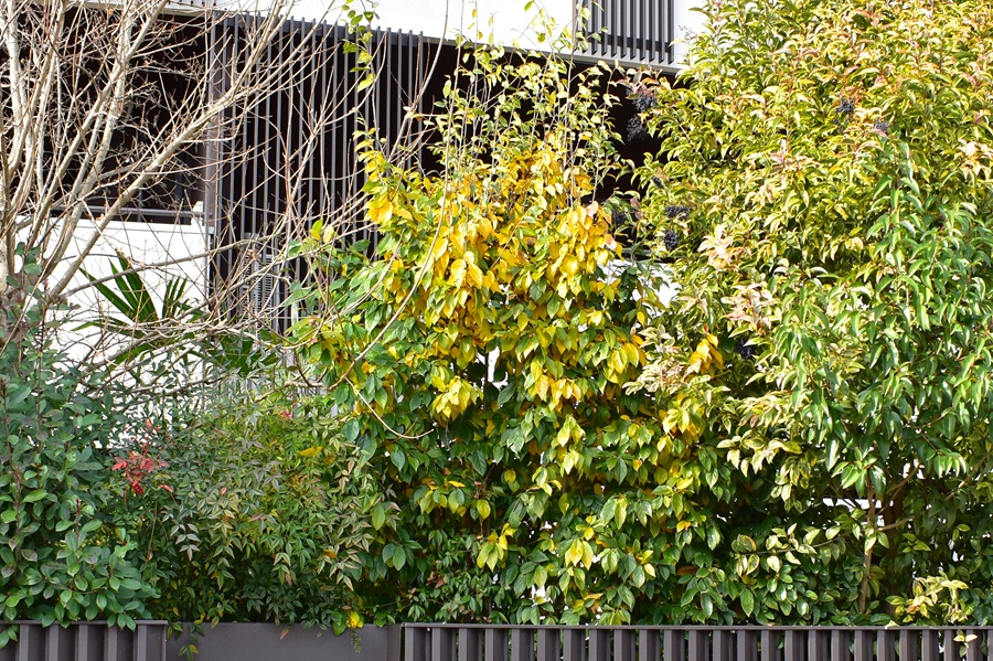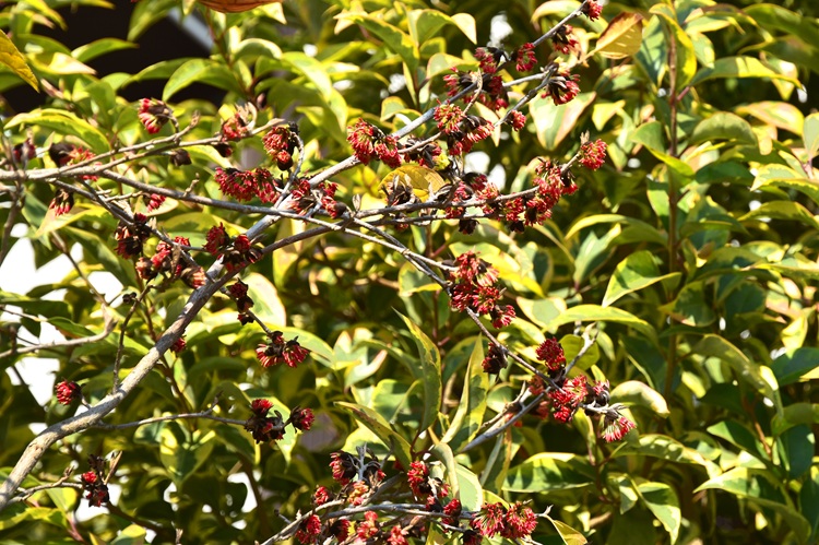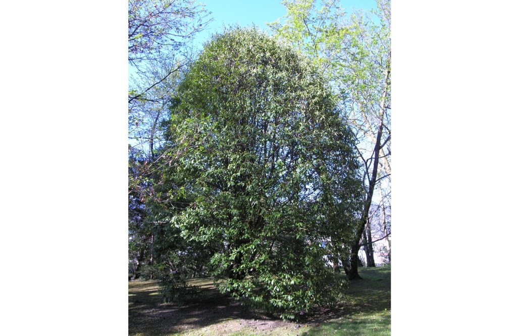 Grosso arbusto con numerosi fusti ascendenti e slanciati, chioma fitta e affusolata. Ottimo per giardini. In città ne ho trovato un unico giovinetto in via Tirana. Questo esemplare in febbraio perde molte delle foglie sui rami più alti, pur essendo la specie segnalata come sempreverde.