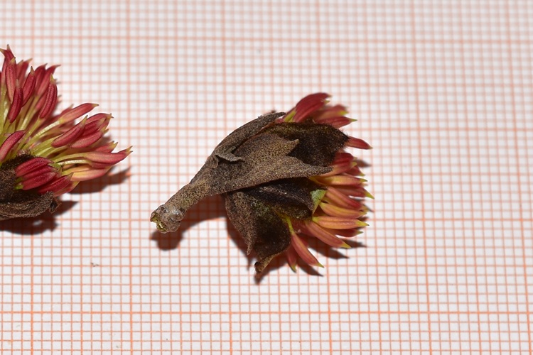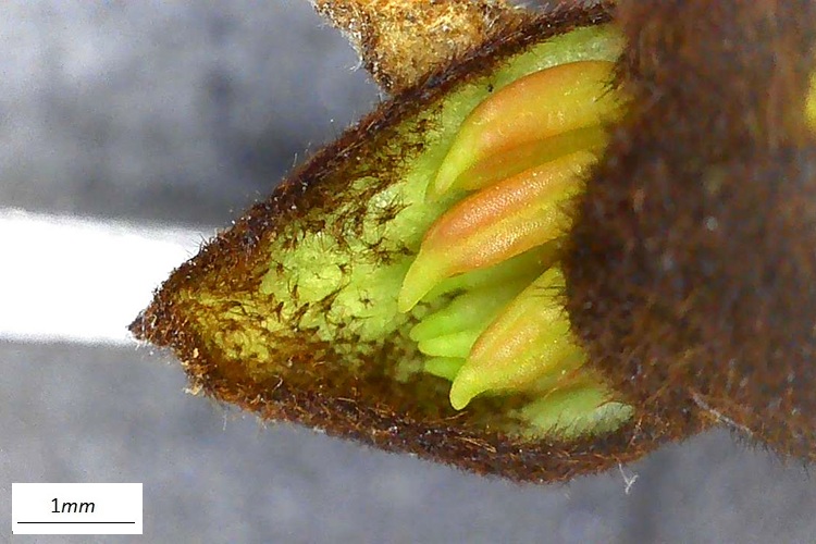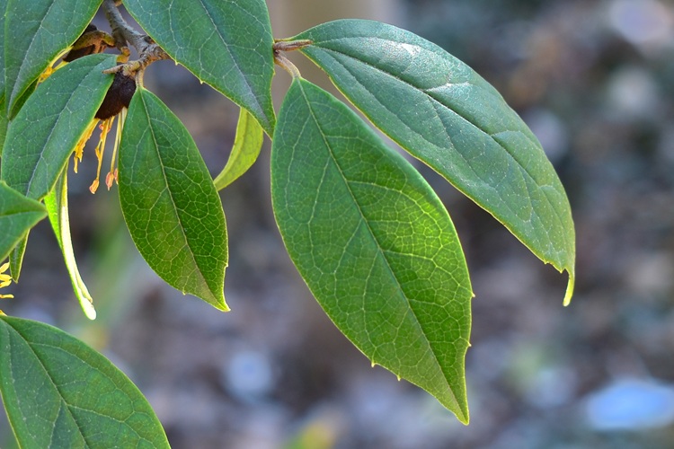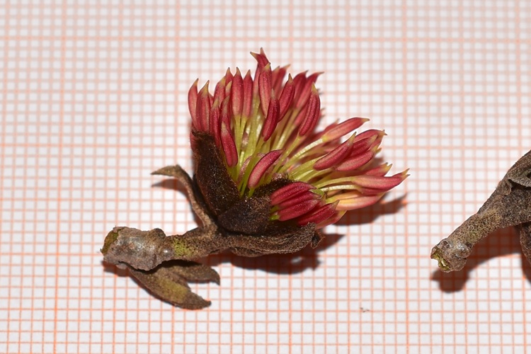 Foliage in gennaioCarico di fiori in febbraioVilla Taranto, Verbania. Foto di Andrea Moro.Foglie coriacee, allungate, apice e base acuti, pagina superiore verde profondo……e brillante (lucida di cera). Venature incassate, le terziarie reticolate. Pagina inferiore glauca e molto più chiara, venature in rilievo (ovvio dopo quanto si è visto per l’altra faccia). Picciolo breve e pelosetto.Bordo con piccoli denti radi, come bene si distingue in questo esemplare dell’Orto Botanico Reale di Madrid. Talvolta bordo intero e mosso.Fiorisce in febbraio in piccoli fioretti raccolti a mazzettiniAntere rossissime sbucano dall’infiorescenza. Ricordano molto quelle della parrozia (stessa famiglia, Hamamelidaceae)Infiorescenza protetta da brattee marrone e pelose Brattea con peli stellatiPeli ben distinguibili anche in questa foto, ottenuta scostando una brattea Antere inizialmente gialleSingolo fioretto con calicetto peloso. Non ha petali, solo sepali. Una mezza dozzina di stami e due stigmi a forma di nastrini ondulati. Ingrandimento del fiore ottenuto da due foto al microscopio. Si possono apprezzare in particolare il calice peloso e i filamenti lunghi, sottili e verdolini. Antera immatura; le macchie nere sono peli stellati.Sezione trasversale dell’antera. Due teche, quattro logge, e prolungamento del filamento al centro.I lunghi stigmi e il calicePistillo composto da un ovario (supero), due stili (brevissimi) e due stigmi. Insomma, due carpelli in tutto.Ovario in marzoSezione trasversale dell’ovario. Due loculi con dentro un ovulo ciascuno.In marzo, antere avvizziteInizio della fruttificazione. Gli stigmi, e anche il calice, permangono a lungo sulla pianta.La struttura che protegge l’infiorescenza. La foto consente di apprezzare le brattee vellutate che la compongono.Il frutto è una capsula marrone e pelosa che si apre in due valveSezione trasversale. All’interno degli alloggiamenti si distinguono i semi.La capsula sembra formata da più strati; quello più interno lignificatoQui di profilo. Al centro si intravvede un seme, purtroppo risecchito.Corteccia grigia, liscia, con numerose lenticelle.