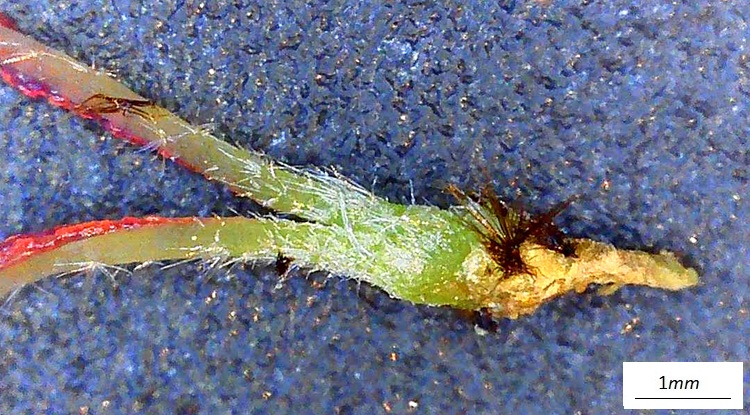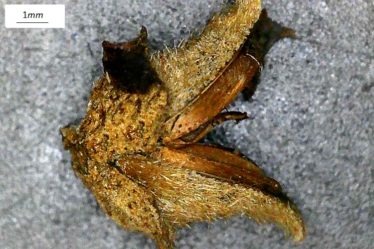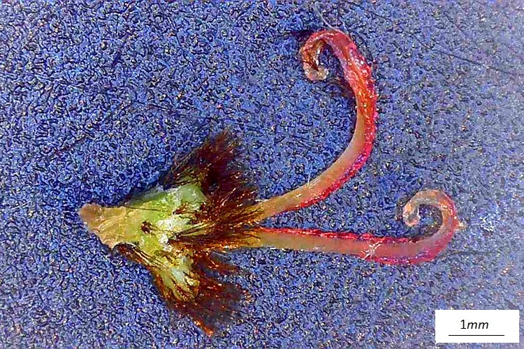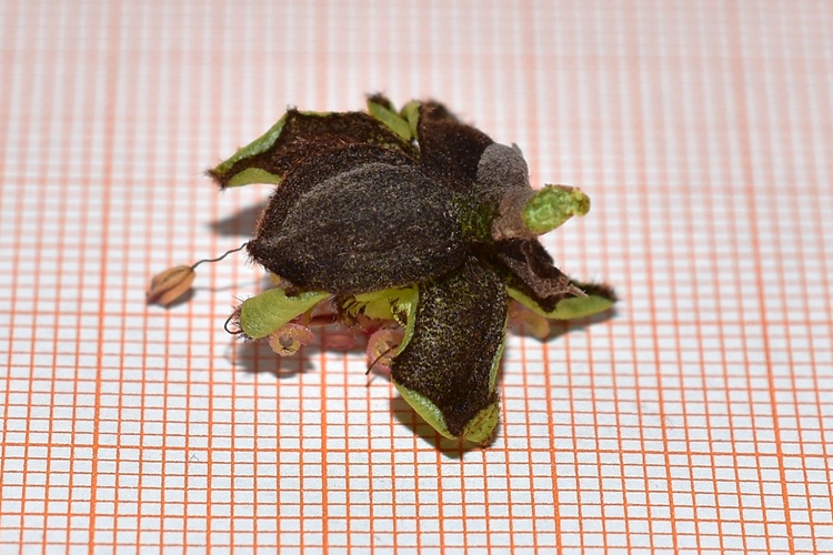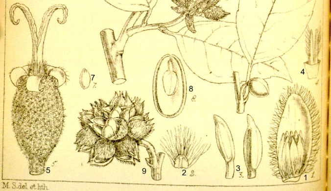 Brattea e fiore maschile 1, frammento del calice 2, antere 3; stigmi in crescita 4, pistillo intero 5, seme 7, embrione 8; infruttescenza 9.