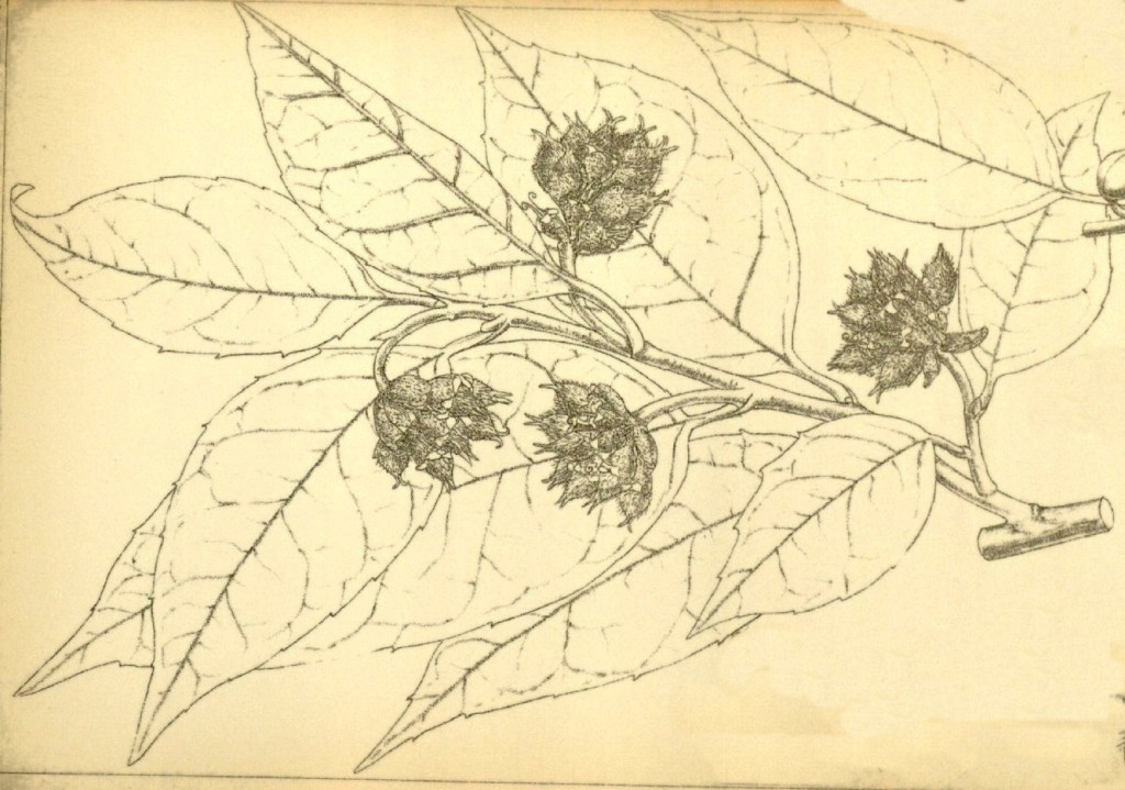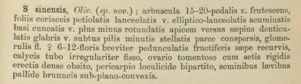 Sycopsis sinensis Oliv. Nome imposto da Daniel Oliver botanico britannico, bibliotecario e poi custode dell’Herbarium del Royal Botanic Gardens di Kew e anche professore di botanica all’UCL (University College di Londra). La specie è descritta per la prima volta con questo nome nel ventesimo fascicolo (1890) della rivista Icones Plantarum; or figures, with brief descriptive characters and remarks of new or rare plants, Londra. La rivista era organizzata in tavole corredate da una descrizione e un commento.
