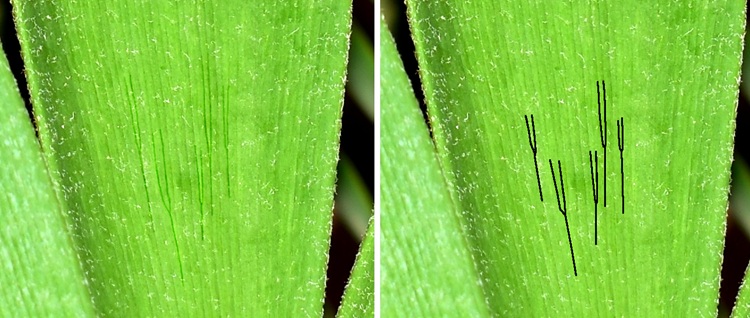 Foglie nastriformi, innestate in cima a brevissimo tronco; colore verde tenue, quasi glauco, coriacee e spesse. Crescono in continuazione dalla base e si seccano in cima.