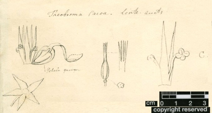 Pagina 782, unico riferimento al bordo fogliare che è detto intero. Seguono altri nomi precedenti molti centrati sul termine cacao. La pianta è collocata nella Classe 18. in Polyadelphia Pentandria (cinque stami fusi in tre o più strutture).