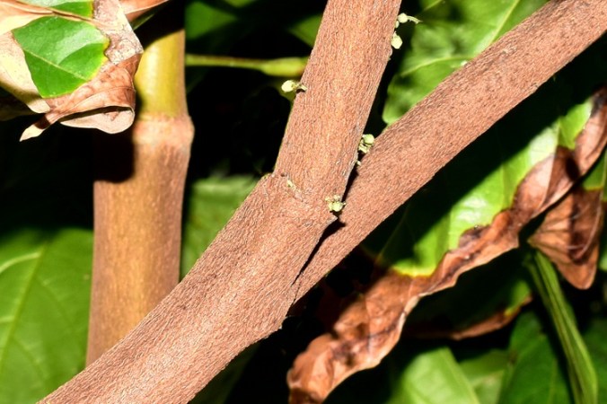 I fiori nascono direttamente dal tronco (caulifloria, dal latino caule che vale fusto e floria fiore)o dai rami più vecchi solitari o a mazzolini; ricordate? anche il cercis faceva così.