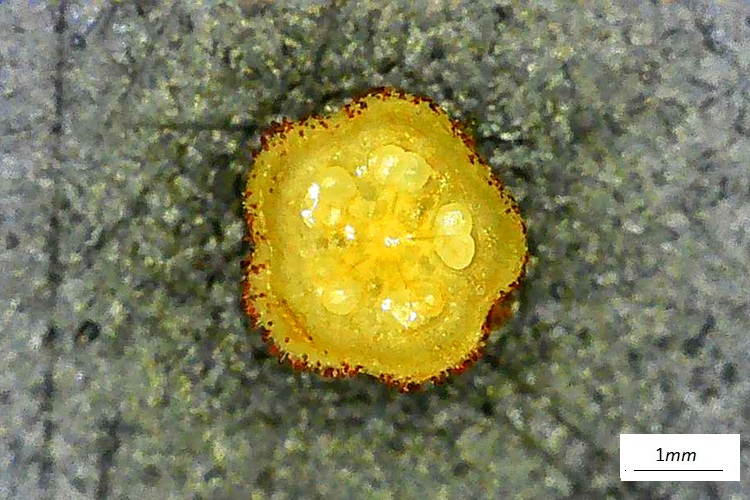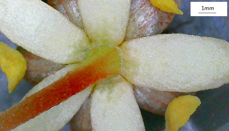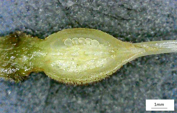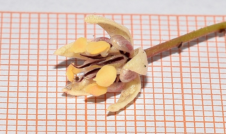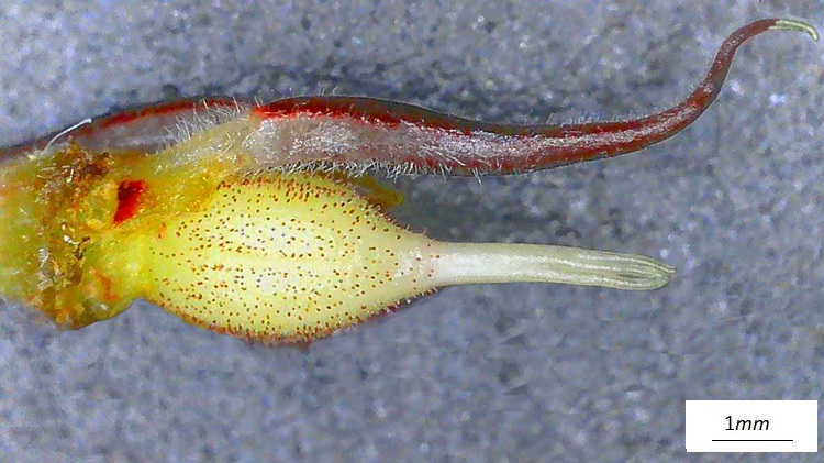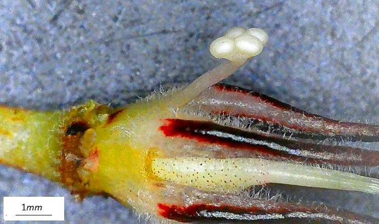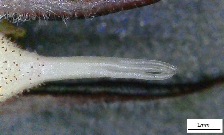 Eccolo nella sua interezza e nudità. La parte a coppa ospita gli stami che sono cinque e rivolti verso l’esterno quasi a cercare rifugio in queste strane conformazioni.Singolo stame. Filamento appiattito (a forma di lesina lo dice Linneo), bianco diafano. Antera con teche ampiamente separate e sacche polliniche quasi distinte.