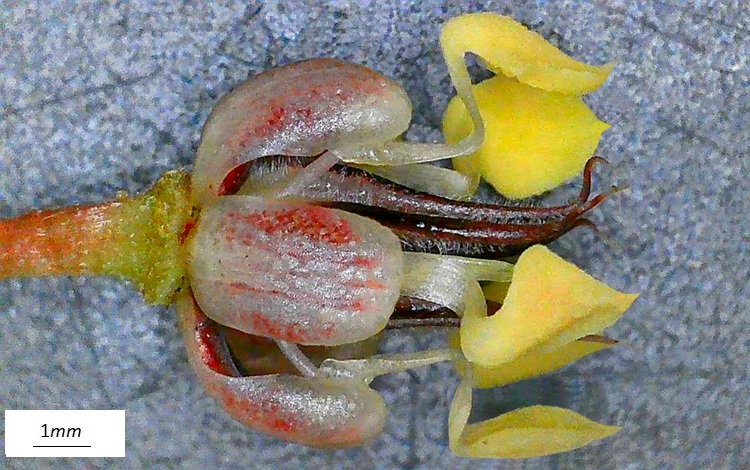 Ho tolto tutti i petali per poter mostrare il comportamento degli stami. Anche uno degli stami è stato asportato, se ne vede la cicatrice tra le due strutture rosso violacee. Le quali strutture sono staminodi. Nella foto si riconosce anche la saldatura di stami e staminodi che forma una sorta di coppa a continuazione del ricettacolo (la struttura è detta ‘nettario’ da Linneo). Dall’apertura lasciata dallo stame staccato si intravvede parte del pistillo.