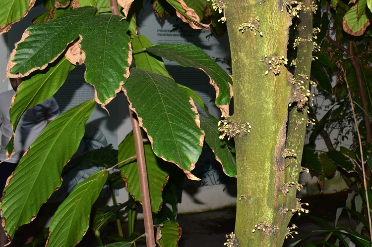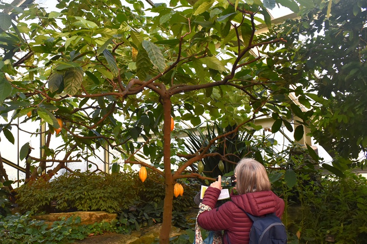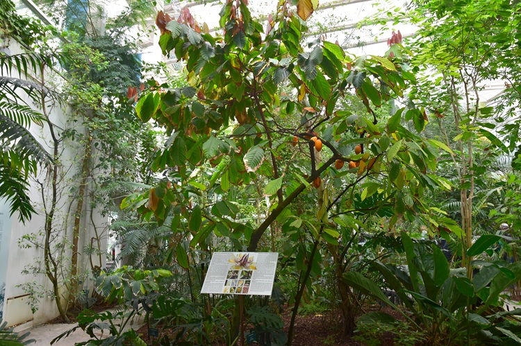 Il fiore è impollinato da un insetto particolare che non è presente in orto, così l’operazione deve essere fatta a mano: in figura il dito pronubo del giardiniere (particolare da un cartello esplicativo).Pistillo (costolature sulla superficie dell’ovario), e stame sterileCinque stigmi appuntitiSezione longitudinale dell’ovario, catene di ovuli attaccati ad una colonna centrale (placentazione ascellare)Sezione trasversale, cinque logge e convessità delle costolature. Diagramma fiorale. Rigida simmetria quinaria: sepali, petali, stami, staminodi, carpelli (compresi stigmi e loculi) rigorosamente in numero di cinque.I fiori sono tantissimi ma solo pochi portano a un frutto maturo e sano. Lo spettacolo è comunque assicurato. Bacche aranciate (cabosse), pesanti, allungate, con vistose costolature; robusto peduncolo (ma questo è ovvio).Dentro numerosi semi immersi in polpa viscida, ma apprezzata. Non è facile procurarsi un frutto aperto, in questa foto, da Wikipedia – Keith Weller, si riconoscono le logge gremite dalla polpa con dentro i semi. Al centro la placenta.Corteccia percorsa da stretti e brevi solchi longitudinali, le creste sono piatte e ruvide. Colore marrone, a meno di muschi variopinti. Giovani rami colla pelle ruvida e marrone rossastra.Quando l’albero non è in fiore, la corteccia appare disseminata di protuberanze granulose e scure (marrone violaceo), sono le regioni dalle quale spuntano i fiori. Sotto cellule meristematiche pronte a trasformarsi nei mattoni che comporranno i fiori (insomma, la Fabbrica di Cioccolato), sopra sughero e vari minerali protettivi che sberluccicano alla luce del flash. La vetrina di uno storico negozio di spezie all’incrocio tra Prato della Valle e Via Belludi; un omaggio al culto del cioccolato. Nel piattino fave di cioccolato, ovvero semi – ma con l’embrione morto da un pezzo.