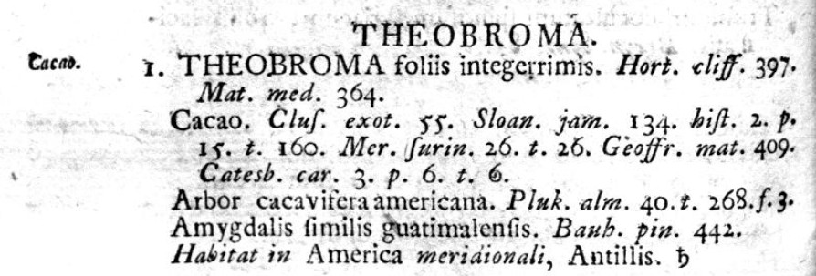 Theobroma cacao L. nome imposto da Linneo nel celeberrimo Species Plantarum, Stoccolma, 1753