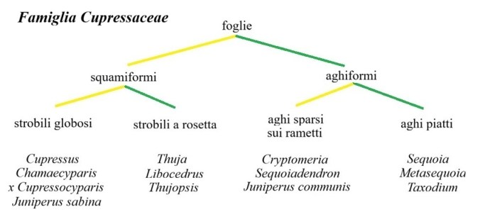 Messi sull’avviso dalle riflessioni precedenti, dedichiamoci alla costruzione di un diagramma ad albero che ci aiuti a districarci nel ginepraio (allusione involontaria, ma ormai mi è scappata…) di generi delle cupressacee.