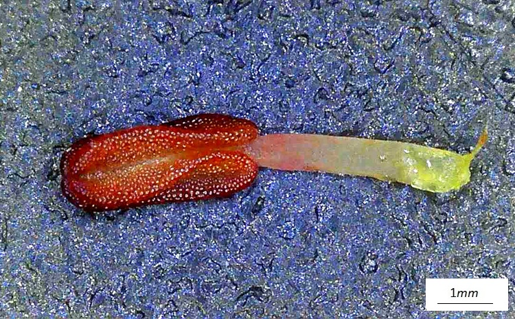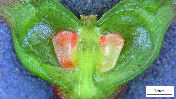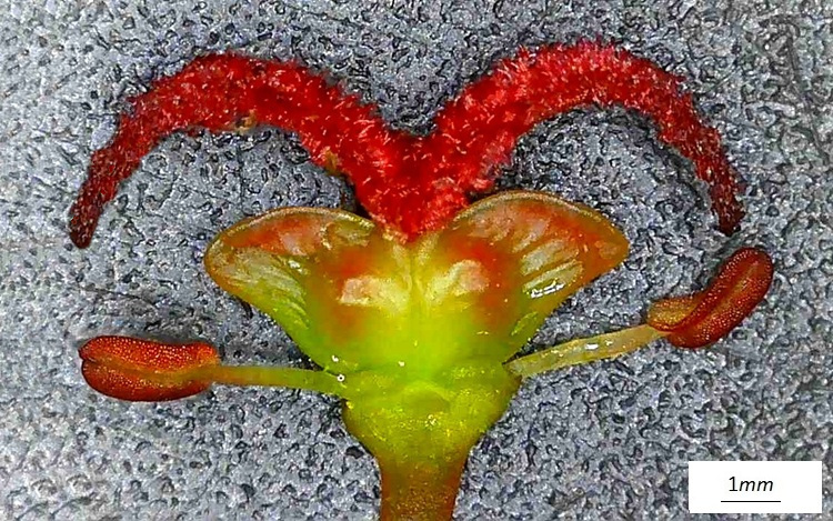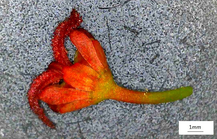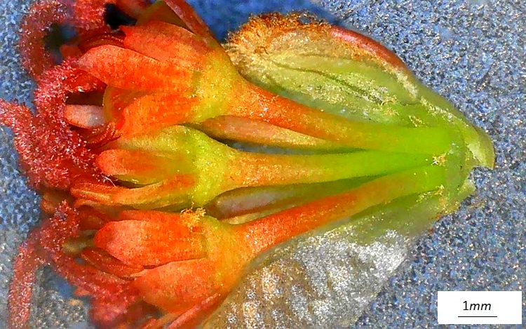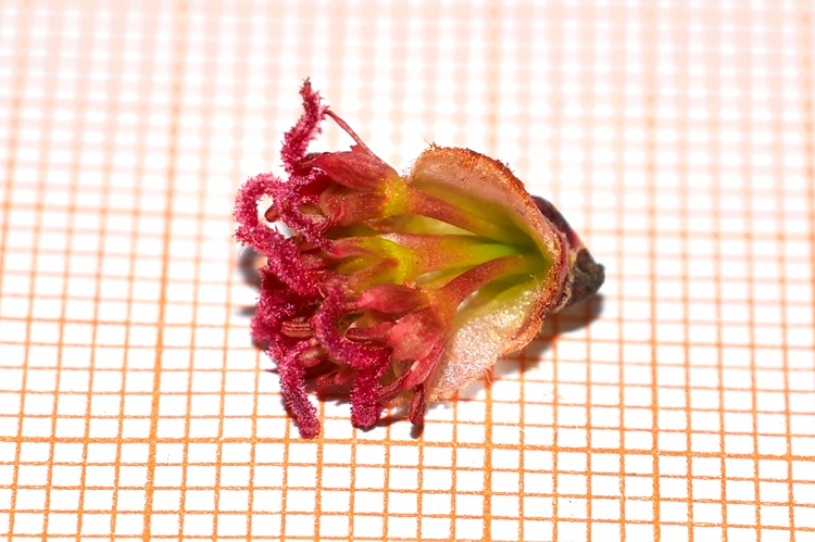 Notevole esemplare in un giardino tra Via Edison e Via Pelosa a Chiesanuova. Si distinguono i rami lunghi e orientati verso l’alto.Breve filare di giovinetti al Parco della Mela Rossa (Mandria); in marzo alla fioritura.Giovane rubrum nell’arbusteto nuovo in Orto – ottobre 2020. Oggi dopo pochi anni ha già un aspetto di pianta quasi matura. La specie è famosa per il foliage, per altro ricordato nel nome.Alcune cultivar diventano rossissime.Fogli a cinque lobi (come molti aceri) grossolanamente dentati; seni poco profondi – molto meno di quelli del saccarino col quale è spesso confuso. I due lobi alla base sono molto più piccoli e abbastanza di frequente la foglia ne ha soli tre. Anzi questa peculiarità può essere d’aiuto al riconoscimento.La pagina superiore è verde brillante, l’inferiore è più chiara, si direbbe glauca. Venature palmate, ben visibili le secondarie. Picciolo lungo, affusolato, arrossato sul lato della pagina superiore……mentre dall’altra parte è verde; con venature più chiare, vistose e… … leggermente pelose ai margini.Fillotassi opposta. Nella foto si riconoscono le perule di una gemma dell’anno; presto cadranno. Si sono formati già due internodi.Giovani rametti rossicci, con lenticelle ellittiche. In cima una gemma, il rametto (è quello della foto precedente) crescerà ancora.I fiori spuntano prima delle foglie in infiorescenze a mazzolini……, a loro volta aggregate in verticilli in cima ai rametti.Singola infiorescenza di mezza dozzina di fioretti sia bisessuali sia unisessuali (solo maschili o solo femminili) sulla stessa pianta, Linneo la dice Polygamia monoecia. Brattee protettive a mo’ di calice.Tolta una brattea appare l’attaccatura dei fioretti; in basso i peduncoli sono verdi di clorofilla.Singoli fiorellino a cinque sepali (i più esterni nella foto) e altrettanti petali, non facilmente distinguibili fra loro se non per la posizione. Colore rosso con tracce giallo verdastre in basso, ‘verdi rosati’ li aveva detti Hermann, ricordate? Ma la parte del leone la fanno gli stigmi.Lunghi e rossissimi. Nella foto si riconosce l’ovario, tipico degli aceri, con due rigonfiamenti (due logge) e le alette delle samare. Ho lasciato due stami, gli altri due li ho tolti.Gli stami sono quattro, o più; han filamenti verdi diafani e antere cremisi, vorrei definirle mosse, ma servirebbe un aggettivo più pregnante ché troppo singolare è il modo in cui si attorcigliano. L’attaccatura del filamento è dorsale.Sezione trasversale dell’ovario, due ovuli per loggia (come per tutti gli aceri due abortiranno) Sezione longitudinale. Gli stili sono brevissimi e si spezzano presto lasciando cadere gli ingombranti stigmi.