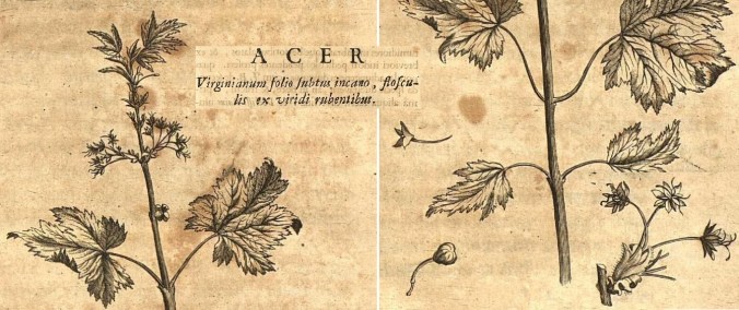 La pagina 1055. Foglia a cinque lobi scarsamente dentati (in Hortus Uppsalenisi, terza riga, le aveva dette ‘acutamente seghettate’), pagina inferiore glauca (carattere che condivide col saccharinum); peduncoli semplici e aggregati in mazzetti. Alla ottava riga compare il riferimento a una tavola di Paul Hermann (1646-1695), Paradisus Batavus, Leida, 1698, che ci affrettiamo a consultare.