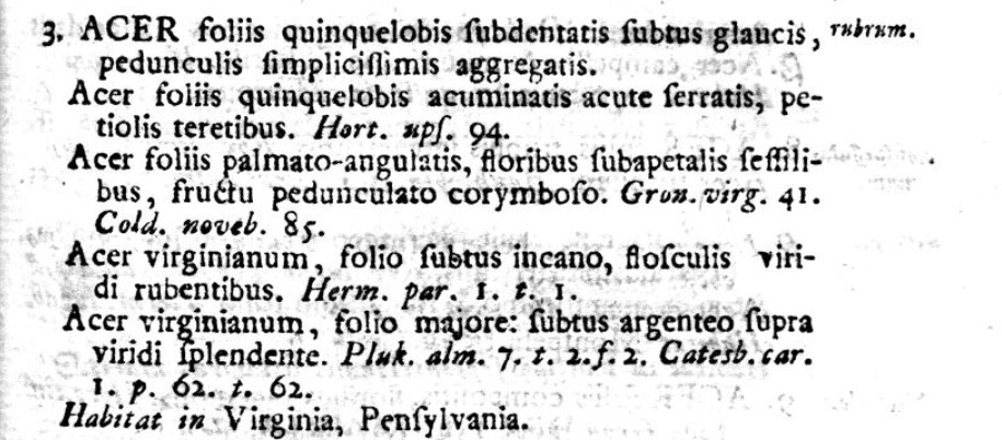 Acer rubrum L. Nome imposto da Linneo nel celeberrimo Species Plantaurm, Stoccolma, 1753