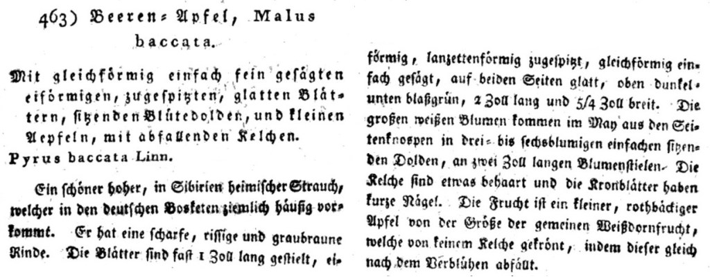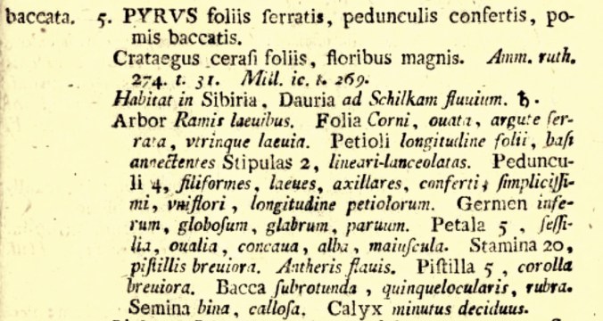 Pagina 75, Mantissa Plantarum, Stoccolma, 1767. La descrizione di Linneo è molto simile a quella del botanico tedesco. Linneo aveva accorpato meli e peri contro una consolidata tradizione. Una storia istruttiva che prima o poi dovremo raccontare.