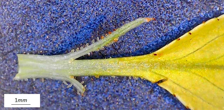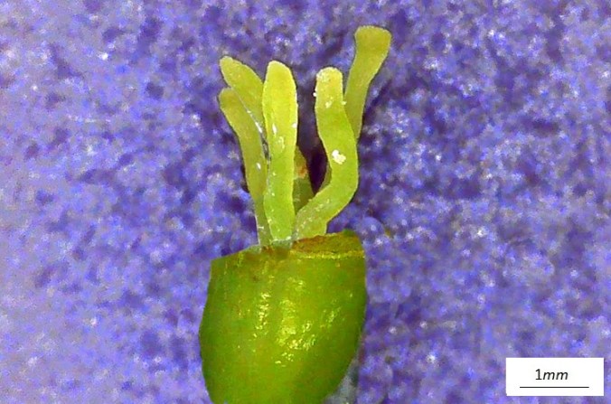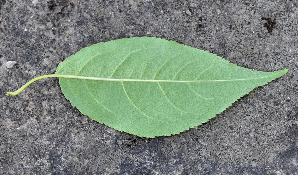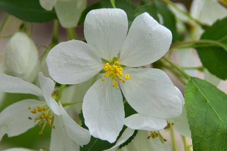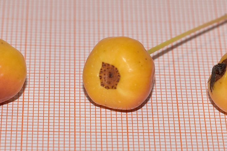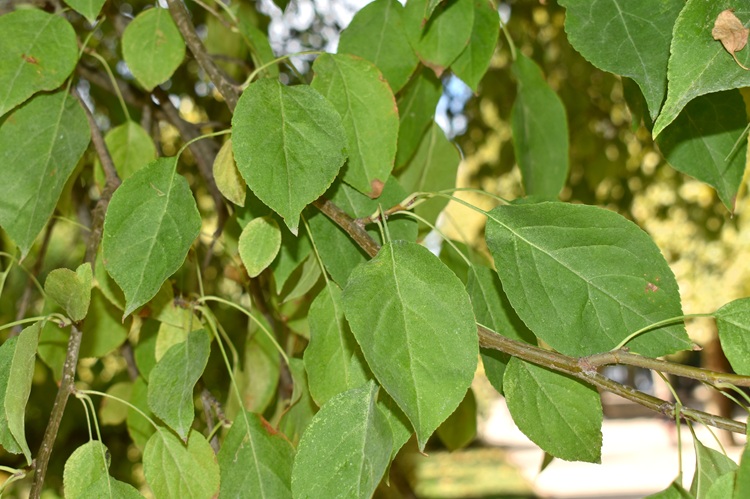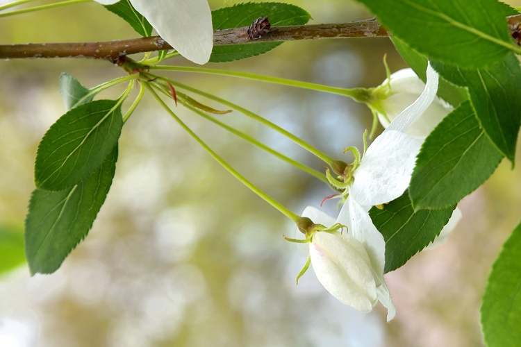 Orto Botanico di Padova. Rami non troppo robusti, i più bassi si allargano, gli altri salgono lenti, il tutto dà alla chioma aspetto semisferico; dopotutto quello che uno si aspetta da un melo (ma attenzione poiché il floribunda non fa affatto così).Jardin des PlantesPortamento arbustivo invece per questo aitante giovanotto del Parco Europa.Foglie alterne, ma nascono tutte assieme da brevi brachiblasti e ciò può indurre in confusine.I rametti consueti (macroblasti) da giovani marrone verdognoli senza lenticelle. Foglie allungate, vertice appuntito, base arrotondata. Consistenza cartacea al tatto. Bordo ‘uniformemente e semplicemente seghettato’, come già detto da Borkhausen.Pagina superiore verde brillante, pallida l’inferiore, glabre entrambe. Le venature secondarie seguono il bordo imitando il corniolo: ‘Folia Corni’, faceva notare Linneo.Le foglie nascono poco prima dei fiori: nella foto l’infiorescenza ancora informe al centro della rosa di foglioline.Due stipole lineari e sottili, presto caduche. Ricoperte di ghiandole a giudicare dalla foto, presa all’inizio di marzo.Fioritura abbondante… …di fiori candidi macchiati di giallo al centroCinque petali ampi al mezzo e stretti alla base, unghia sottile. Stami numerosi (Icosandria), antere giallissime.Infiorescenza a mazzolini di pochi fiori (in vero ‘ombrelle sessili’). Aspetto grazioso in ragione di lunghi e sottili peduncoli, sepali quasi filiformi e arricciati, un rigonfiamento colorato in corrispondenza dell’ovario infero.I boccioli sono bianchi al contrario di moltissimi meli da fiore che li hanno rossissimi. Un buon carattere per l’identificarlo, se non fosse che alcune cultivar di baccata li hanno pure loro rossi: il Cacciatore di Alberi è avvisato.Fiore in formazione ai primissimi stadi. Si riconoscono gli stravaganti sepali.Denudato da sepali, petali e stami mostra cinque stili separati; si salderanno alle basi solo in seguito, come usano fare i meli; mentre nei peri restano sempre staccati.Frutti su lunghi peduncoli e di minute dimensioni (come quelli del biancospino, ricordate?)‘Piccole mele dalle guance rosse’ aveva detto Brokhausen intendendo non uniformemente arrossate. Manca il calice, al suo posto una vistosa cicatrice. Molti meli lo fanno, ma domestica e floribunda conservano il calice gelosamente.Le melette restano a lungo sulla pianta.La corteccia (in vero scorza) si sfalda in piccole placche irregolari,……colore grigio con regioni rossastre.
