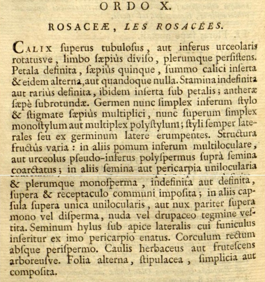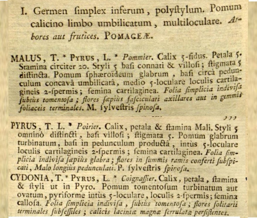 Vale la pena, però, procedere con ordine, onde approfittare del genio del Jardin du Roi per addentrarci ulteriormente tra i caratteri dei due generi. Nella foto la pagina 343 di Genera Plantarum, Parigi, 1789, con la descrizione dei caratteri della famiglia. Raggruppamento ampio di cui le Pomaceae sono solo una piccola parte.
