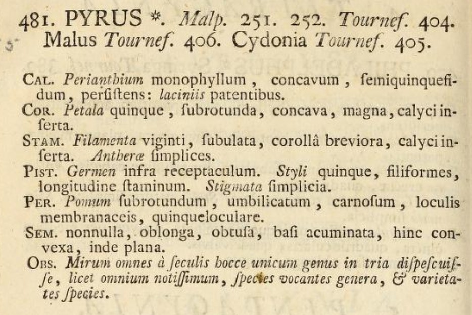 Linneo è felice di poter accorpare i generi (e quale sistematico non lo sarebbe?) e si abbandona, con evidente soddisfazione, al commento precedente (comportamento rarissimo). Nel libro citato troviamo: il numero di stami e pistilli (ovviamente); l’ovario infero, il frutto che è un pomo carnoso con logge membranose a cinque celle all’interno (il torsolo).