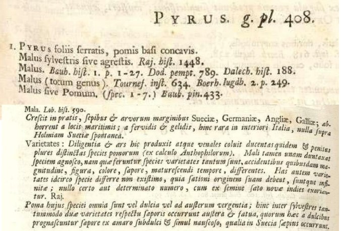 A pagina 189 di Hortus Cliffortianus, Leida, 1736, Linneo unifica i generi. Alla specie 1. pone il vecchio Malus, che ora è chiamato ‘Pyrus foliis serratis, pomis basi cancavis’ (Pero a foglie seghettate e frutti incavati alla base – presso il picciolo). Si ricordi che non aveva ancora introdotto i nomi binomiali.