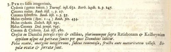Alla specie 2. annovera il vecchio Pyrus, che ora è detto ‘Pyrus foliis serratis, pomis basi productis’ (Pero con foglie seghettate e frutti allungati alla base).