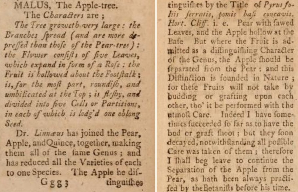 Poi prosegue: ‘Il Dr. Linnaeus ha unito il Pero, il Melo e il Cotogno, rendendoli tutti dello stesso Genere; e ha ridotto tutte le varietà di ciascuno a un’unica specie.’ E ribadisce che la forma del frutto dovrebbe essere accettata come carattere dirimente. Quindi produce un nuovo argomento: quando si cerca di innestarli gli uni sugli altri, rigettano l’innesto. Pertanto: ‘chiedo il permesso di continuare la separazione del Melo dal Pero, come è sempre stato praticato dai Botanici.’ Miller chiede il permesso? Non si dovrebbe farlo in questioni scientifiche, ma enorme doveva essere l’autorità del Botanico svedese. A meno che il Giardiniere di Chelsea, non stia sbeffeggiando il suo rivale.