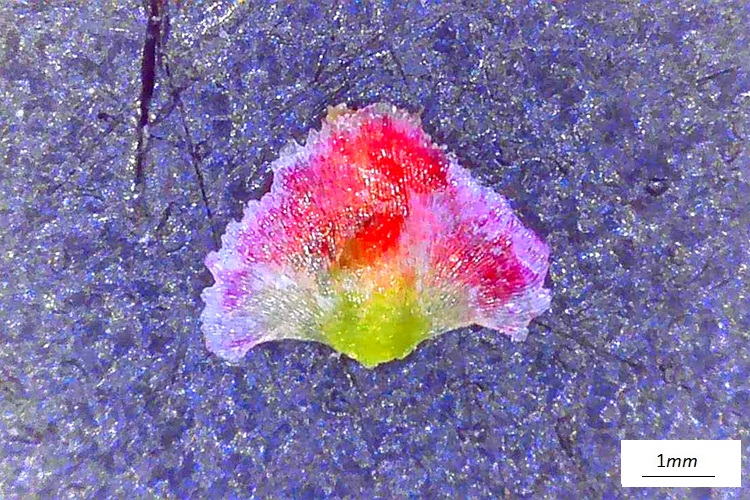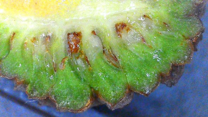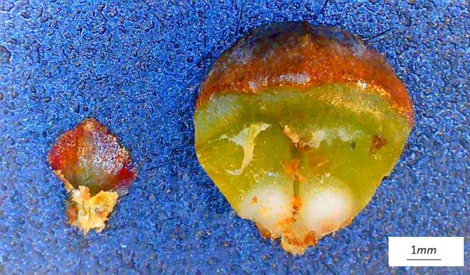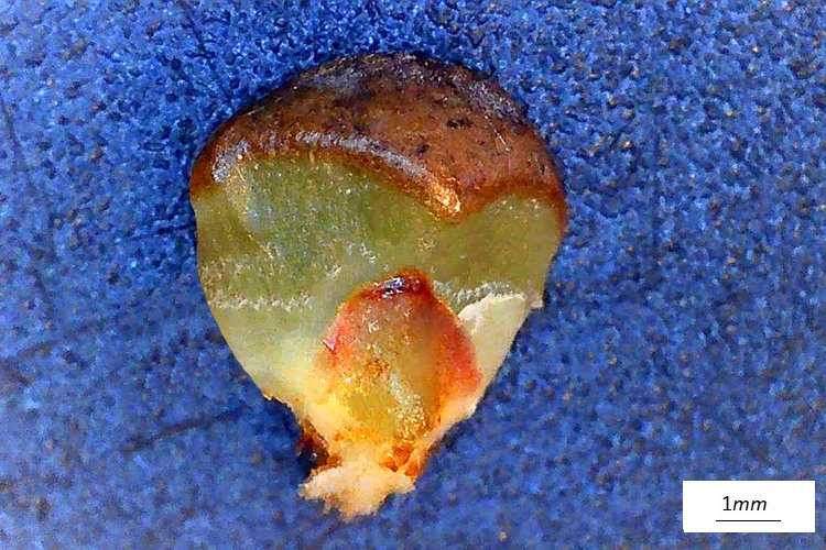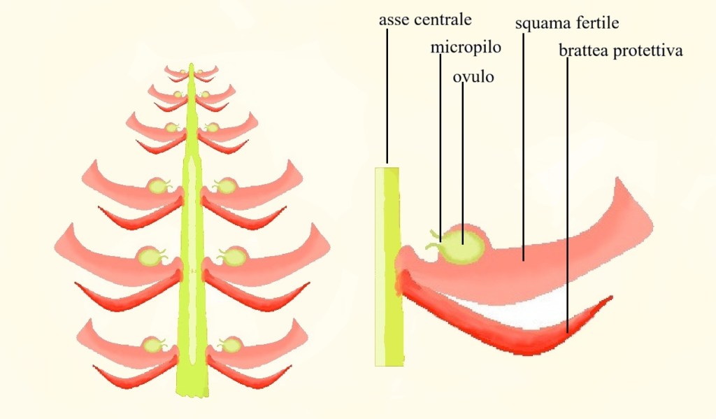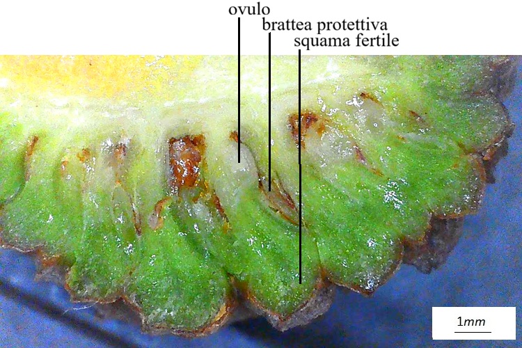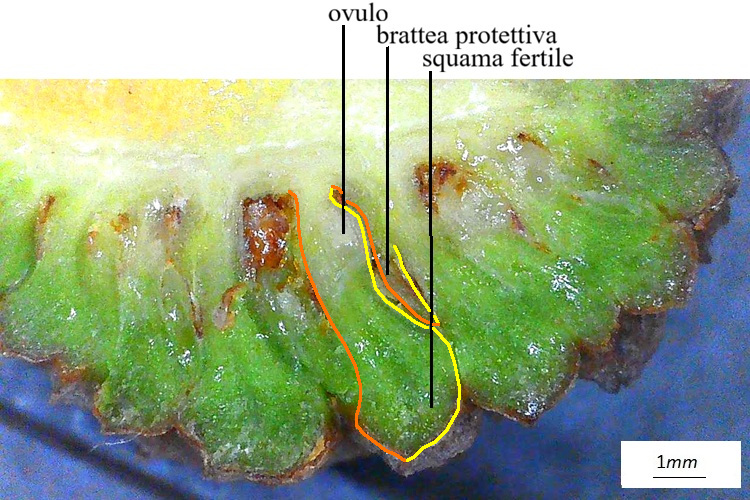 In questa foto della base del cono si distingue meglio il gioco della coppia squama fertile-brattea protettiva, la prima verde e la seconda rossa. Si riconosce l’andamento a spirale. Brattea protettiva. Pagina inferiore (nelle foglie, e simili, per convenzione la pagina superiore è quella che guarda il rametto, o, come nel nostro caso, l’asse dello strobilo).Squama ovulifera (pagina superiore). Si distinguono i due ovuli con i micropili in basso (rivolti verso l’asse del cono). Nei pini il micropilo è accompagnato da due protuberanze laterali che guidano il polline (bracci micropilari).Dopo qualche mese il cono femminile si presenta già come una piccola pigna. Ma non ci si lasci ingannare, anche se i tessuti si sono ingrossati e irrobustiti, la fecondazione è lenta ad avvenire.Sezione longitudinale di un cono di qualche mese, si distinguono le brattee protettive più piccole e le squame fertili cresciute molto di più, fra le due strutture gli ovuli. La foto precedente con indicazioni espliciteHo estratto la coppia squama fertile-brattea protettiva, con non poca fatica. Si possono meglio apprezzare le differenze nelle dimensioni.Tolta la piccola brattea, la foto mostra la faccia superiore della brattea e quella superiore della squama che porta i due alloggiamenti degli ovuli. Inoltre si intravvedono, ombreggiate, le ali dei futuri semi che si formano dai tessuti della squama.Tali erano invece le dimensioni relative tra brattea protettiva (in basso) e squama seminifera (appoggiata sopra) qualche mese prima.Ho completato la foto precedente indicando in arancio le facce inferiori (abassiali) di squama e brattea rispettivamente, e in giallo le facce superiori (adassiali).