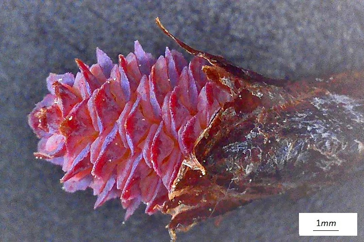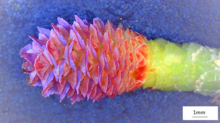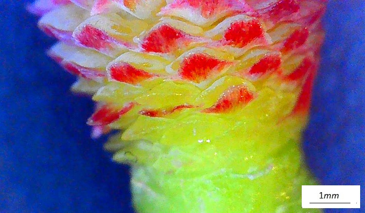 I coni femminili sono formati da squame inserite a spirale su un asse centrale. Parlando con una certa libertà, possiamo affermare che uno strobilo si comporta come una infiorescenza.Nell’ingrandimento si distingue meglio la struttura. A destra la base coperta da brattee marrone fittissime, a sinistra il cono rosso cardinale.Ho tolto le brattee della base. A destra il peduncolo ‘nudo’, verde di clorofilla.In vero quella che sembra un’unica squama è una struttura composta: una squama fertile più una brattea protettiva. Nella foto la seconda appare rossa smagliante e la prima come appoggiata sopra.