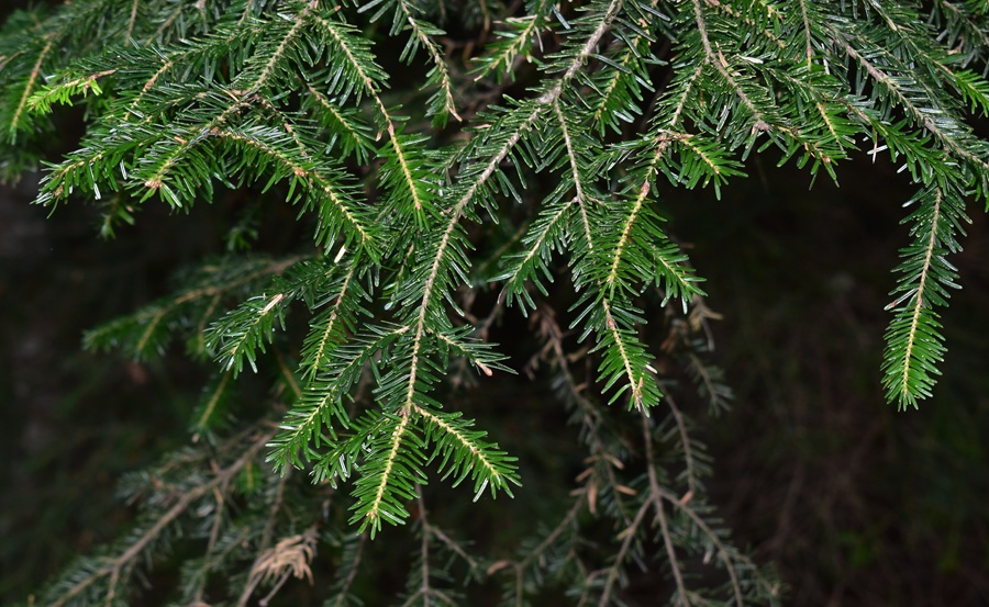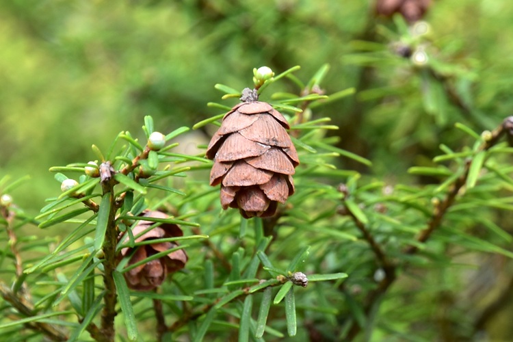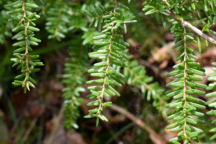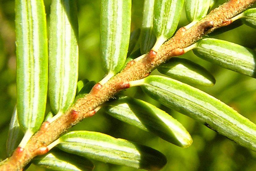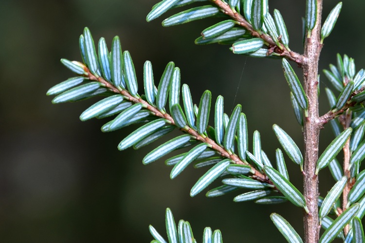 Tsuga chinensis, aghi piatti, vertice arrotondato, non tutti di uguale lunghezza, verde lucido sopraSotto due fasce bianche. Base con breve picciolo, carattere che lo distingue da tutte le altre pinacee citate nel blog.(Foto, Tsuga canadensis)Anche le tsughe, come i pecci, hanno i pulvini (brevi prominenze legnose), bene si distinguono in questa foto presa in prestito da Andrea Moro. Pigna piccola, marrone a maturità, con poche squame allargate.