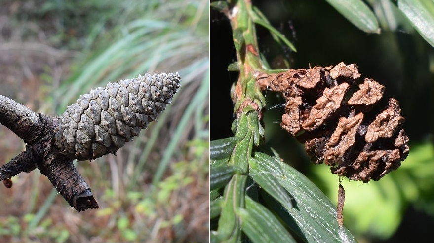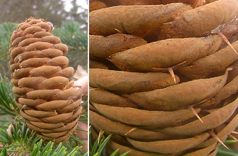 Coni delle Pinacee. Si va da quelli di larice e tsughe piccoli come una noce e quelli grandi e pesanti del pino domestico e dei cedri; da eretti come abeti, cedri, larici a pendenti; fino al cono di Pseudotsuga menziesii dalle brattee esagerate.