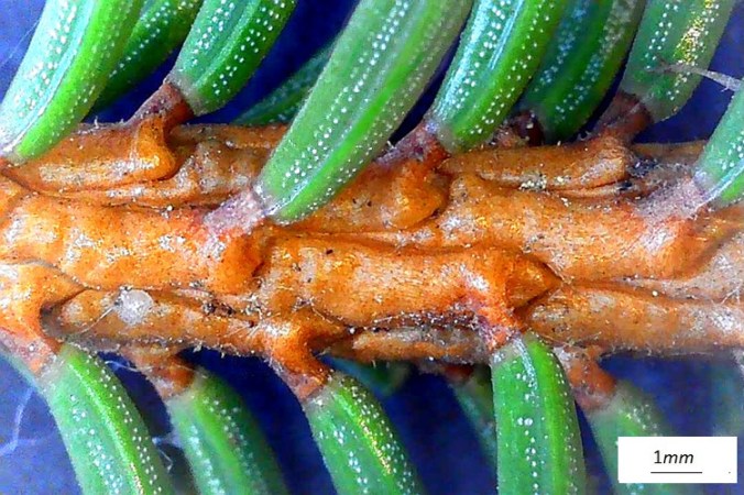 Gli aghi sessili sono montati su brevi prominenze legnose (pulvini). Quando gli aghi cadono queste permangono rigide e appuntite sui rametti. Il carattere distingue l’abete rosso dal bianco: se passando la mano sul rametto spoglio lo sentite come una grattugia, allora state toccando un peccio.