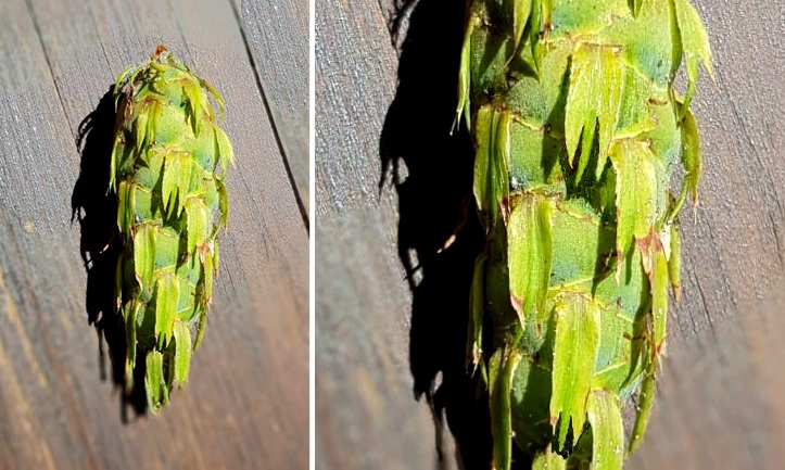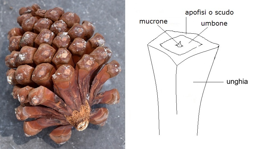 Mentre nelle pinacee le squame si sovrappongono l’una all’altra come le tegole di un tetto o le squame di un pesce, nelle cupressacee sono affiancate. Nella foto, pino marittimo a sinistra, sequoia gigante a destra.Per capirlo, si rifletta su come è fatta la squama nelle due famiglie. Nelle cupressacea un pedicello (unghia) è inserito su un asse centrale, all’estremo opposto è attaccato, come la testa di un chiodo, lo scudo. Nelle pinacee invece l’unghia è piatta e si appoggia sia a quelle che la precedono, sia a quelle che la seguono. Insomma rimane nascosta dalle facce superiori delle due squame che la precedono (nel verso che dalla base va al vertice della pigna).