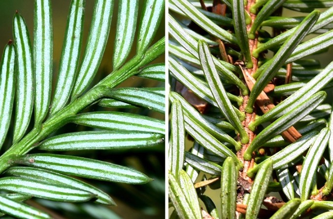 Nelle cupressacee la base dell’ago sembra avvolgere il rametto (tecnicamente si dice decorrente) al contrario nelle pinacee l’ago pare infisso nel rametto. A sinistra nella foto (Sequoia sempevirens)a destra (Abies procera).